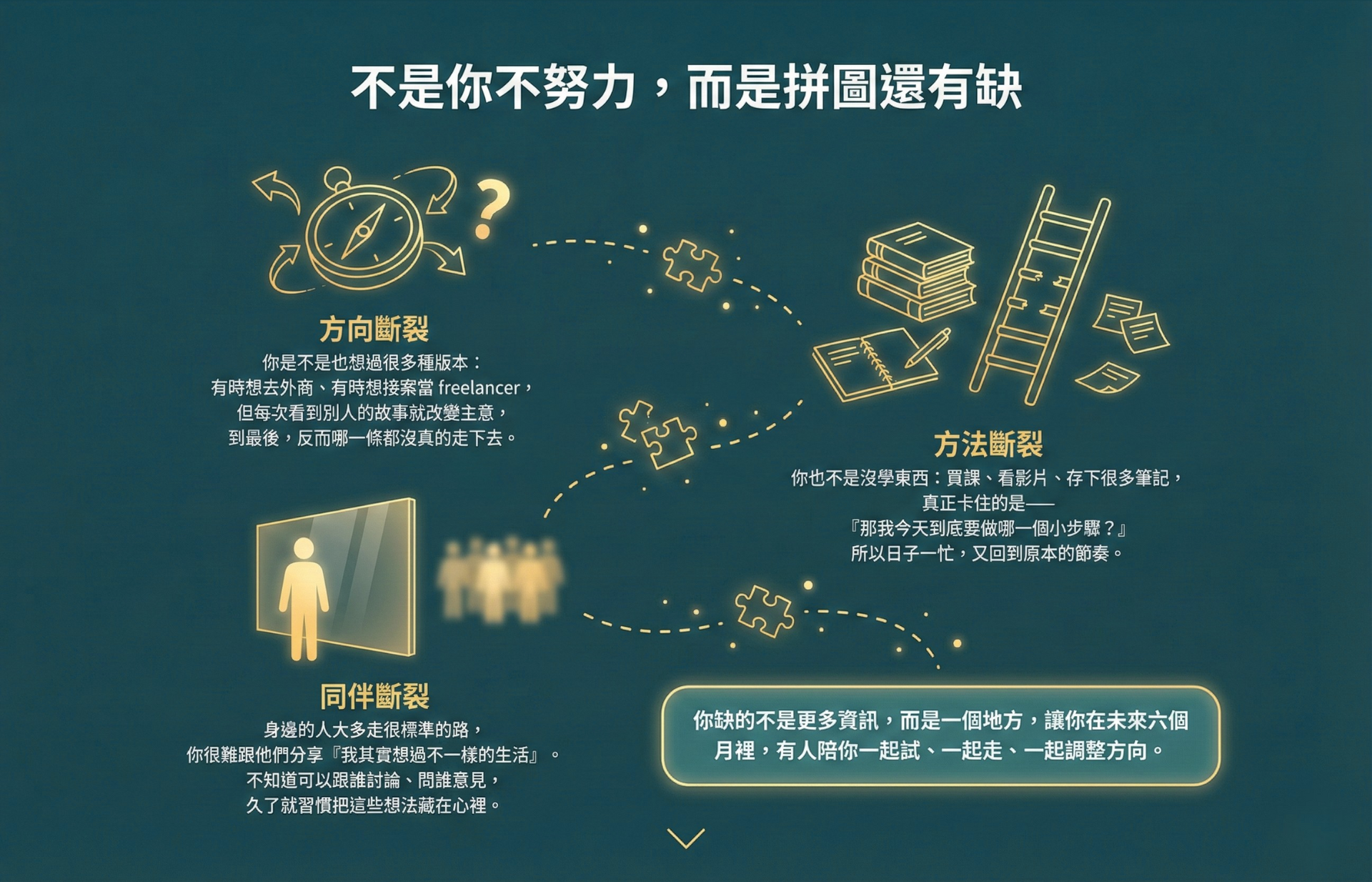 你缺的不是更多資訊,而是一個地方,讓你在未來六個月裡,有人陪你一起試、一起走、一起調整方向。